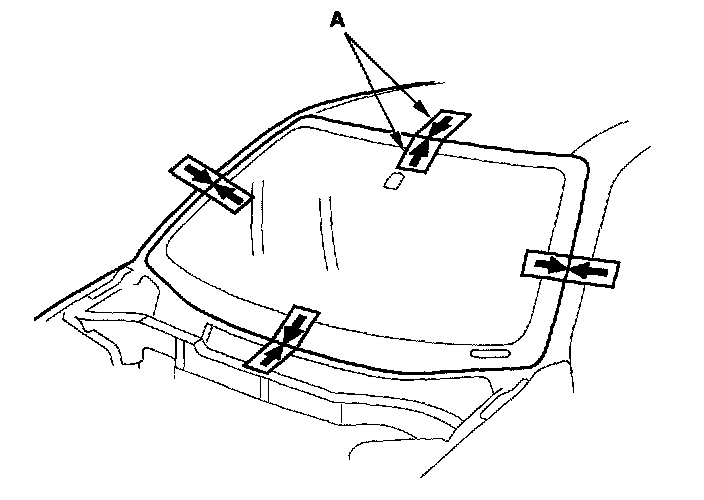 15. Set the windshield in the opening, and center it. Make alignment marks (A) across the windshield and body with a grease pencil at the four points shown. Be careful not to touch the windshield where adhesive will be applied.