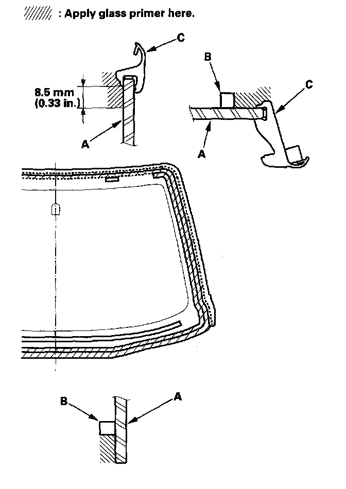 17. With a sponge, apply a light coat of glass primer around the edge of the windshield (A) between the dam (B) and molding (C) as shown, then lightly wipe it off with gauze or cheesecloth: