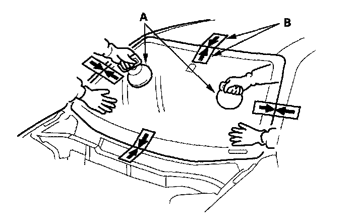 11. Apply primer (3M N-200, or equivalent) to the areas between the alignment marks (A), and glue the adhesive tape (Sedan) (B) (NITTO 501, or equivalent) to the edge of the windshield. Be careful not to touch the windshield where adhesive will be applied.