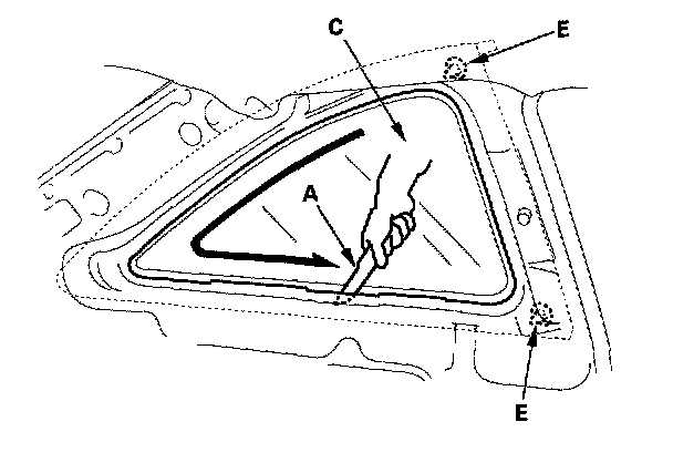 - If the quarter glass (C) is to be reinstalled, take care not to damage the molding (D).