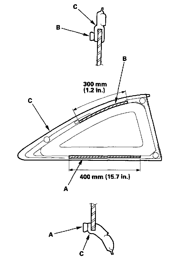 9. If the old quarter glass is to be reinstalled (and either clip is broken off the molding), apply a light coat of primer (C-100, or equivalent), then apply butyl tapes (A) and (B) to the molding (C) as shown: