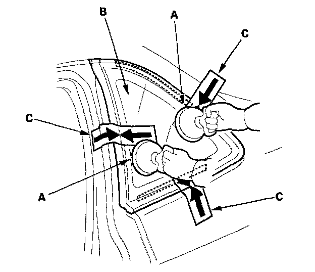 17. Use suction cups (A) to hold the quarter glass (B) over the opening, align the clips or the alignment marks (C) made in step 10, and set it down on the adhesive. Lightly push on the quarter glass until its edges are fully seated on the adhesive all the way around. Do not open or close the doors until the adhesive is dry.