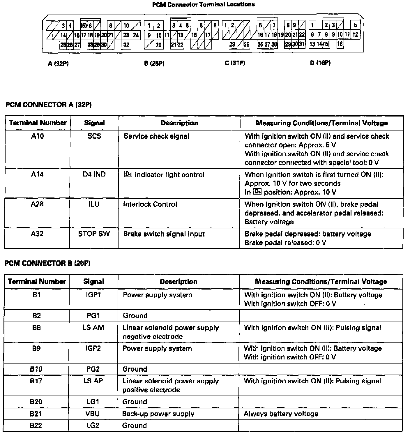 The PCM terminal voltage and measuring conditions are shown for the connector terminals that relate to the A/T control system. The other PCM terminal voltage and measuring conditions are described under Computers and Control Systems/Normal Scan Data Values.