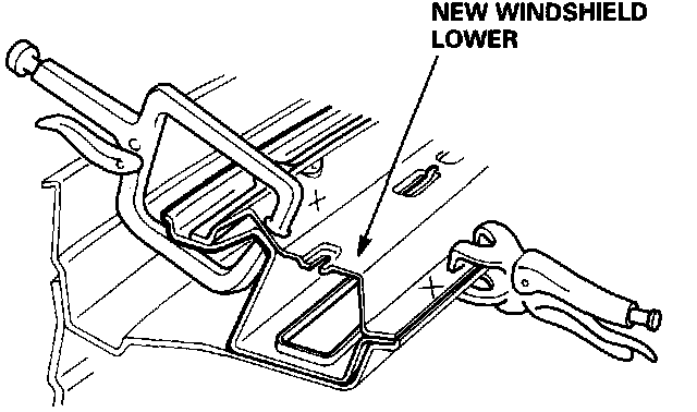 - Clamp the new windshield lower in place with vise- grips and squill vises.