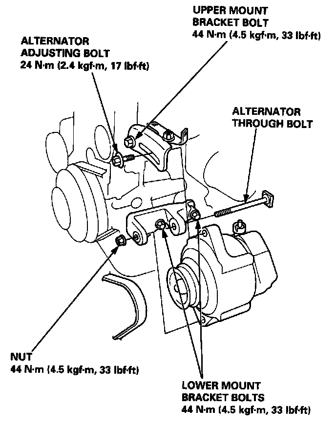 5. Remove the adjusting bolt and through bolt nut, then remove the alternator belt from the pulley.