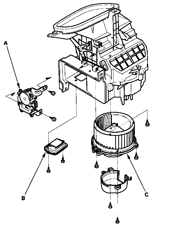 - The recirculation control motor (A), the blower resistor (B) and the blower motor (C) can be replaced without removing the blower unit.