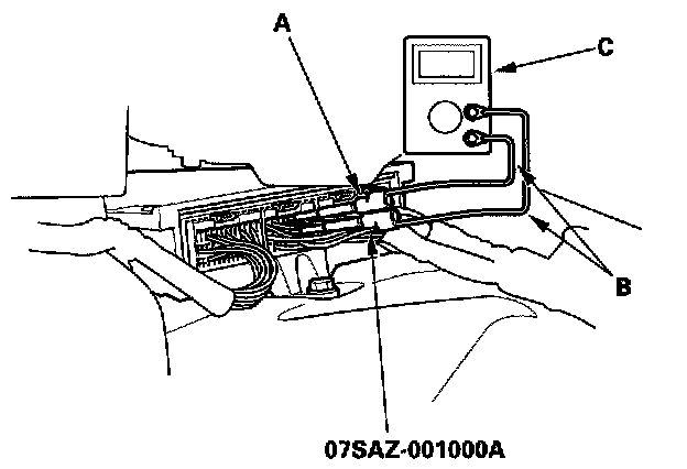 1. Connect the backprobe adapters (A) to the stacking patch cords (B), and connect the cords to a multimeter (C).