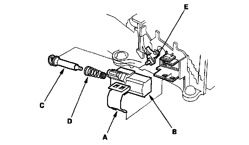 4. Install the shift lock solenoid plunger (C) and plunger spring (D) in the new shift lock solenoid.