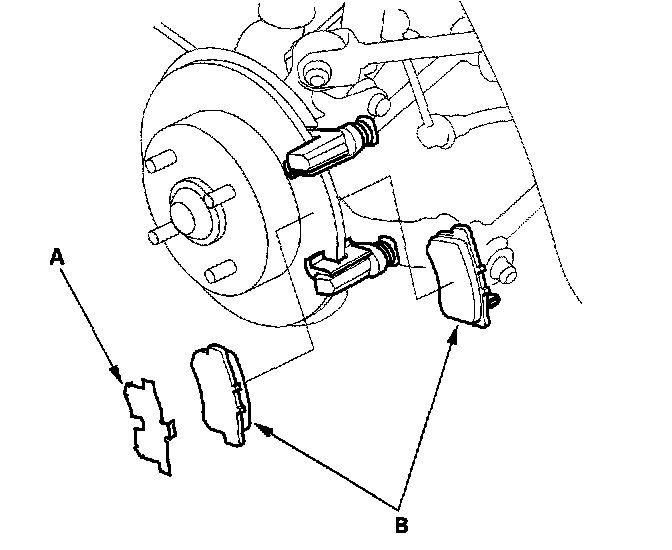 5. Remove the pad shim (A) and brake pads (B).