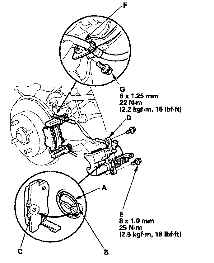 15. Install and torque the caliper bolts (E) to proper specification.
