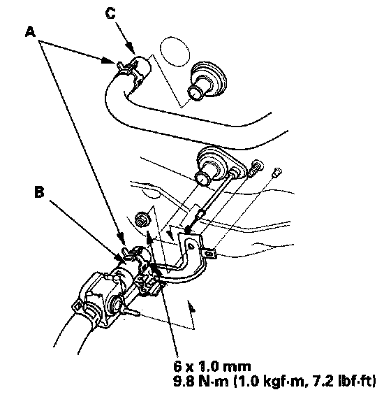 3. From under the hood, open the cable clamp (A), then disconnect the heater valve cable (B) from the heater valve arm (C). Turn the heater valve arm to the fully opened position as shown.
