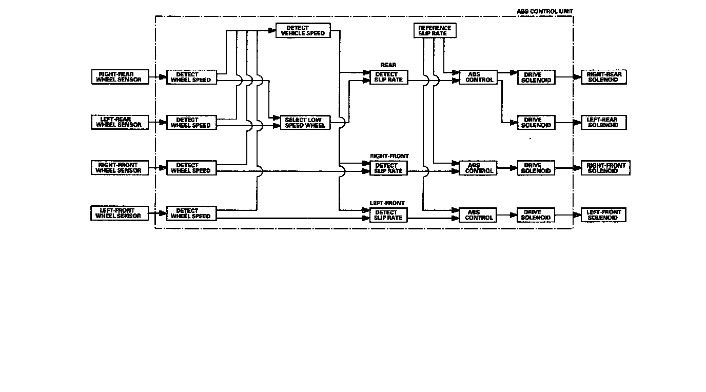 The ABS control unit detects the wheel speed based on the wheel sensor signal it received, then it calculates the vehicle speed based on the detected wheel speed. The control unit detects the vehicle speed during deceleration based on the rate of deceleration.