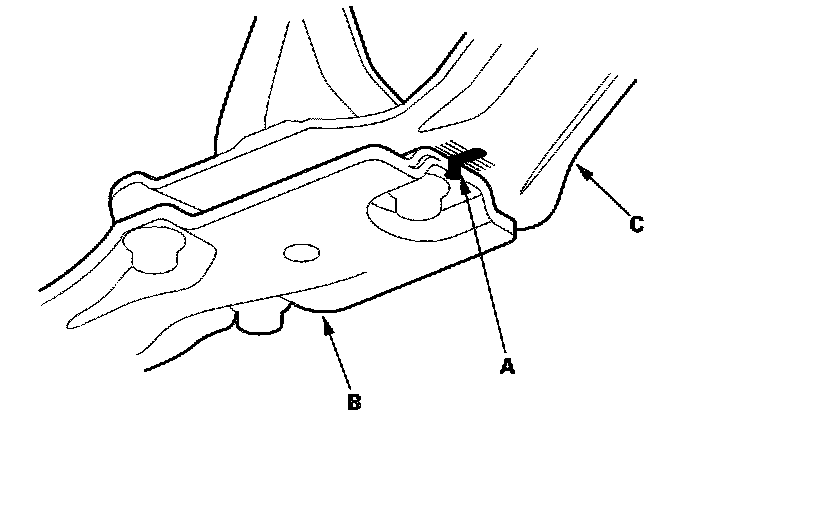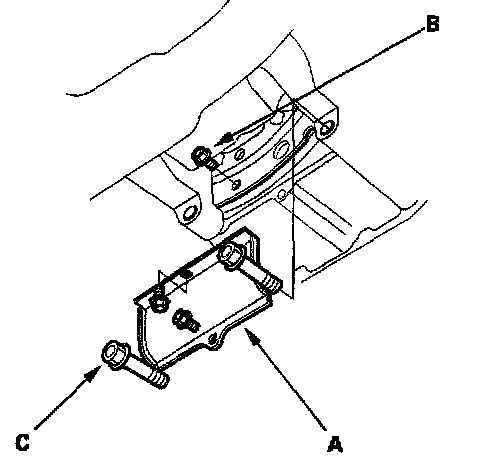 35. Install a 6 x 1.0 x 14 mm bolt (A) and nut (B) on the shift cable cover (C), then reinstall the shift cable cover to the torque converter housing. (The torque converter may stay on the engine, and the bolt head will support the torque converter, when the transmission is removed.)