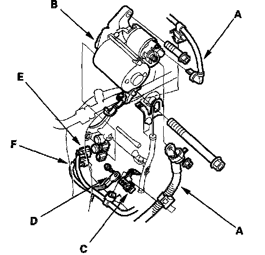 12. Disconnect the shift solenoid valve B connector (E), and C connector (F), then remove the harness clamp from the clamp bracket.