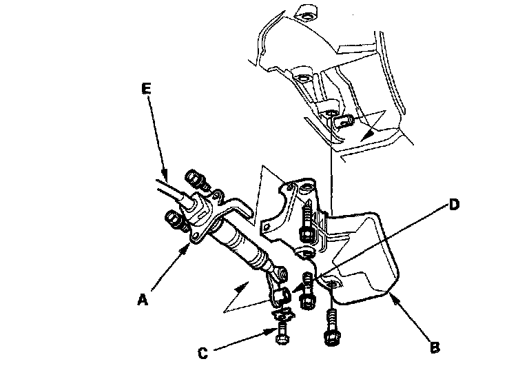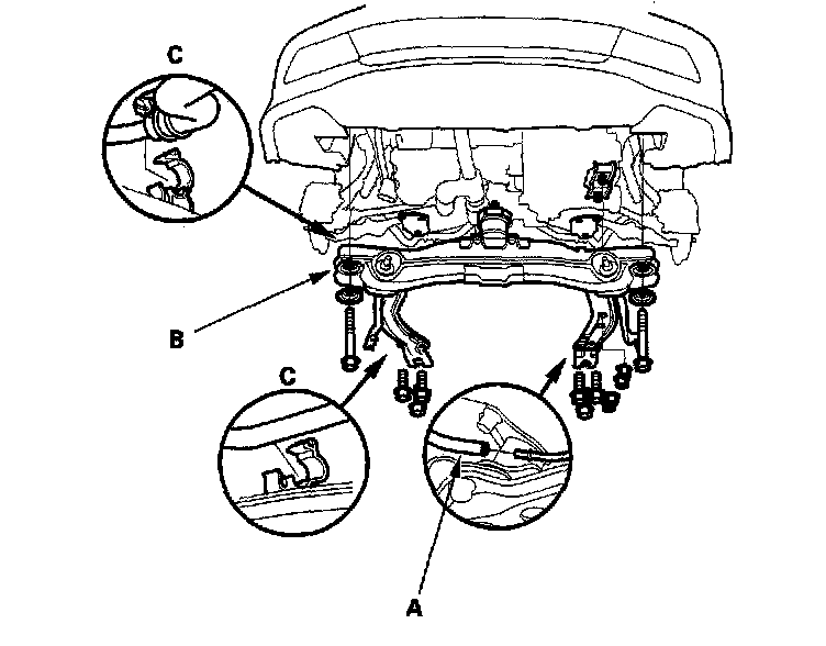 26. Disconnect the vacuum tube (A) on the front beam (B), and unclamp the power steering fluid pipe (C) from the clamps on the front beam.