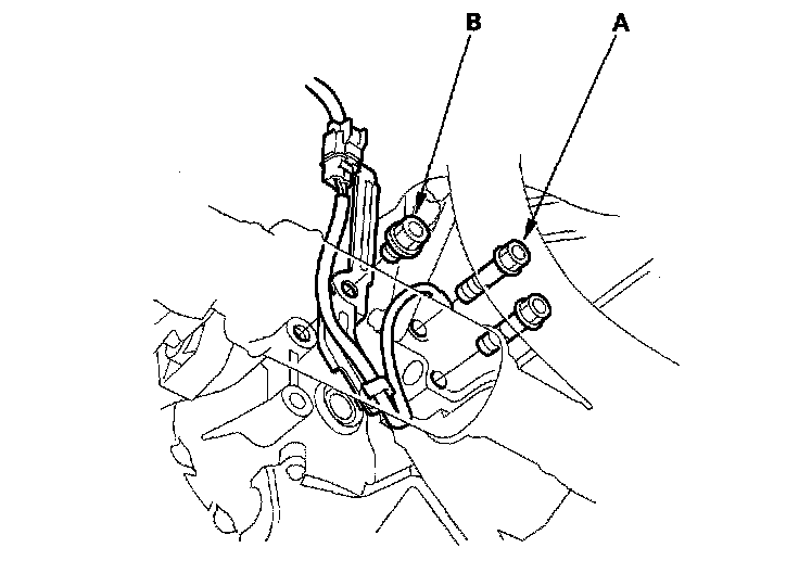 41. Remove the transmission housing mounting bolts (A) and connector bracket bolt (B).