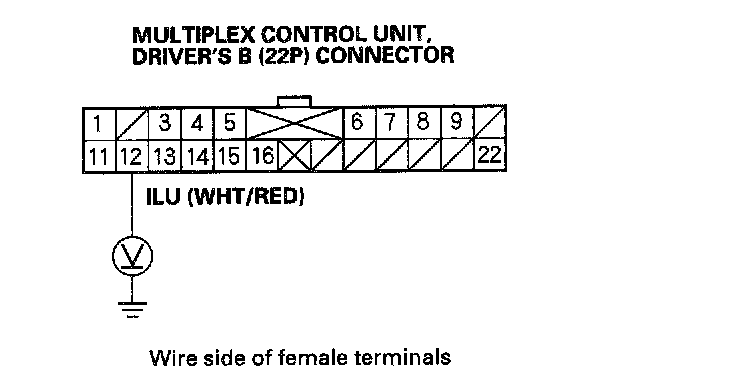 6. Measure the voltage between the B22 terminal of the multiplex control unit, driver's B (22P) connector and body ground.