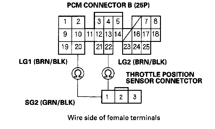 16. Check for continuity between the No. 1 terminal of the throttle position sensor and the B20 or B22 terminal of the PCM.