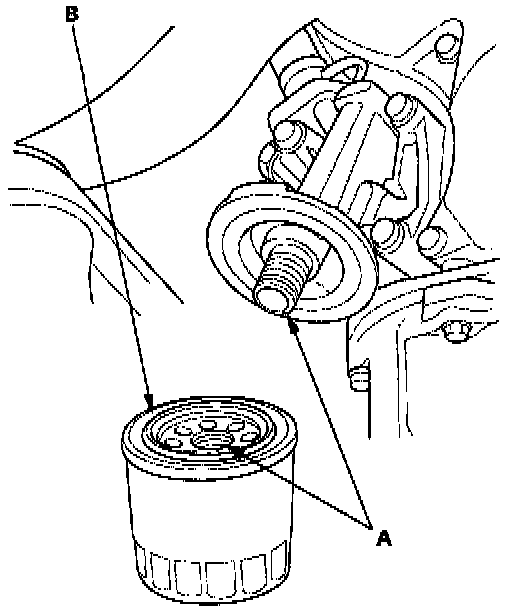 2. Inspect the threads (A) and rubber seal (B) on the new filter. Wipe off the seat on the engine block, then apply a light coat of oil to the filter rubber seal. Use only filters with a built-in bypass system.