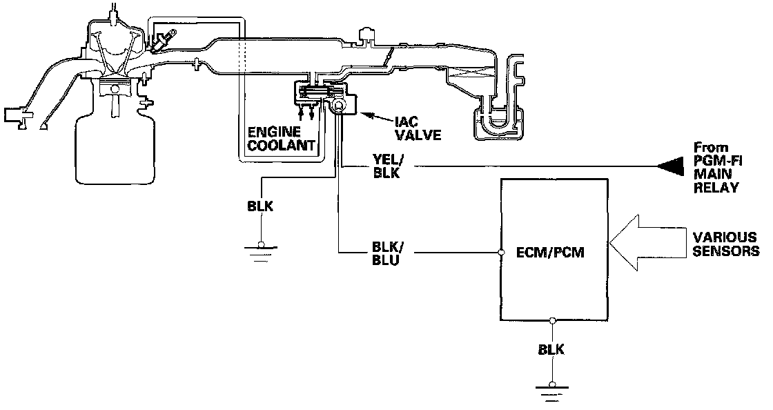 Idle Control SystemWhen the engine is cold, the A/C compressor is on, the transmission is in gear, the brake pedal is pressed, the P/S load is high, or the alternator is charging, the ECM/PCM controls current to the IAC valve to maintain the correct idle speed. Refer to the System Diagram to see the functional layout of the system.