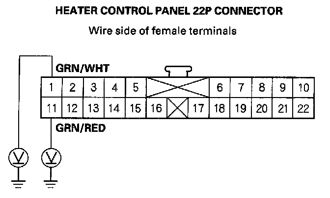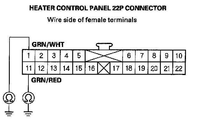 8. Check for continuity between the No.1 and No.11 terminals of the heater control panel 22P connector and body ground individually.