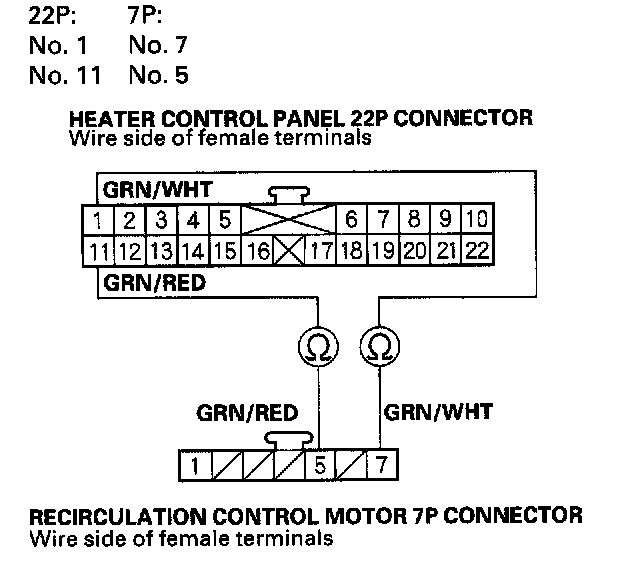 11. Check for continuity between the following terminals of the heater control panel 22P connector and the recirculation control motor 7P connector.