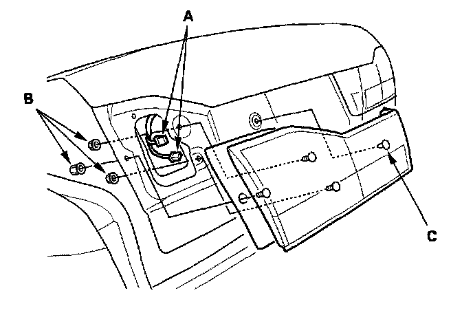 3. Remove the three mounting nuts (B) and a clip (C), then pull out the inner taillight.