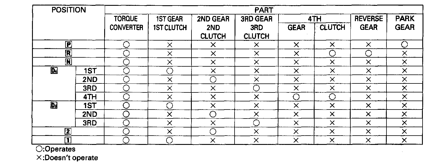 In D4 or D3 position, the optimum gear is automatically selected from the 1st, 2nd, 3rd and 4th gears, according to conditions such as the balance between the throttle opening (engine loading) and vehicle speed.