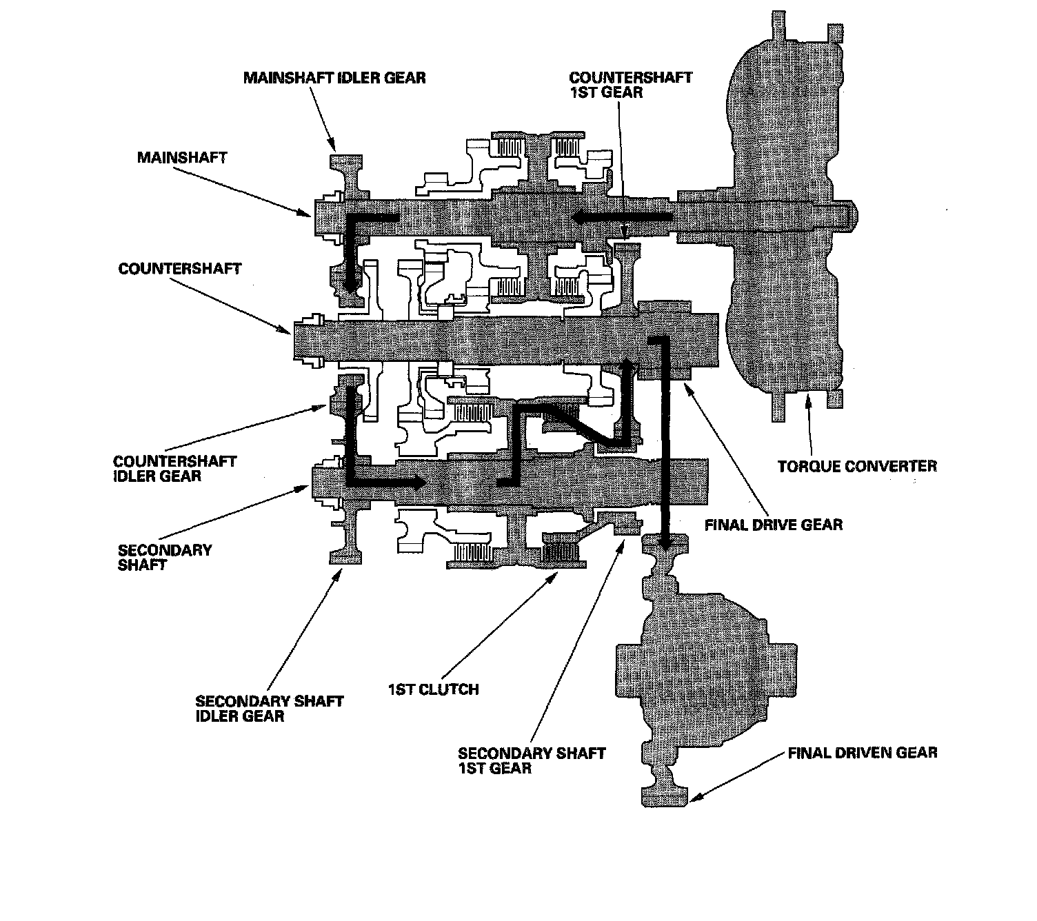 - Hydraulic pressure is applied to the 1st clutch, then the 1st clutch engages the secondary shaft 1st gear with the secondary shaft.