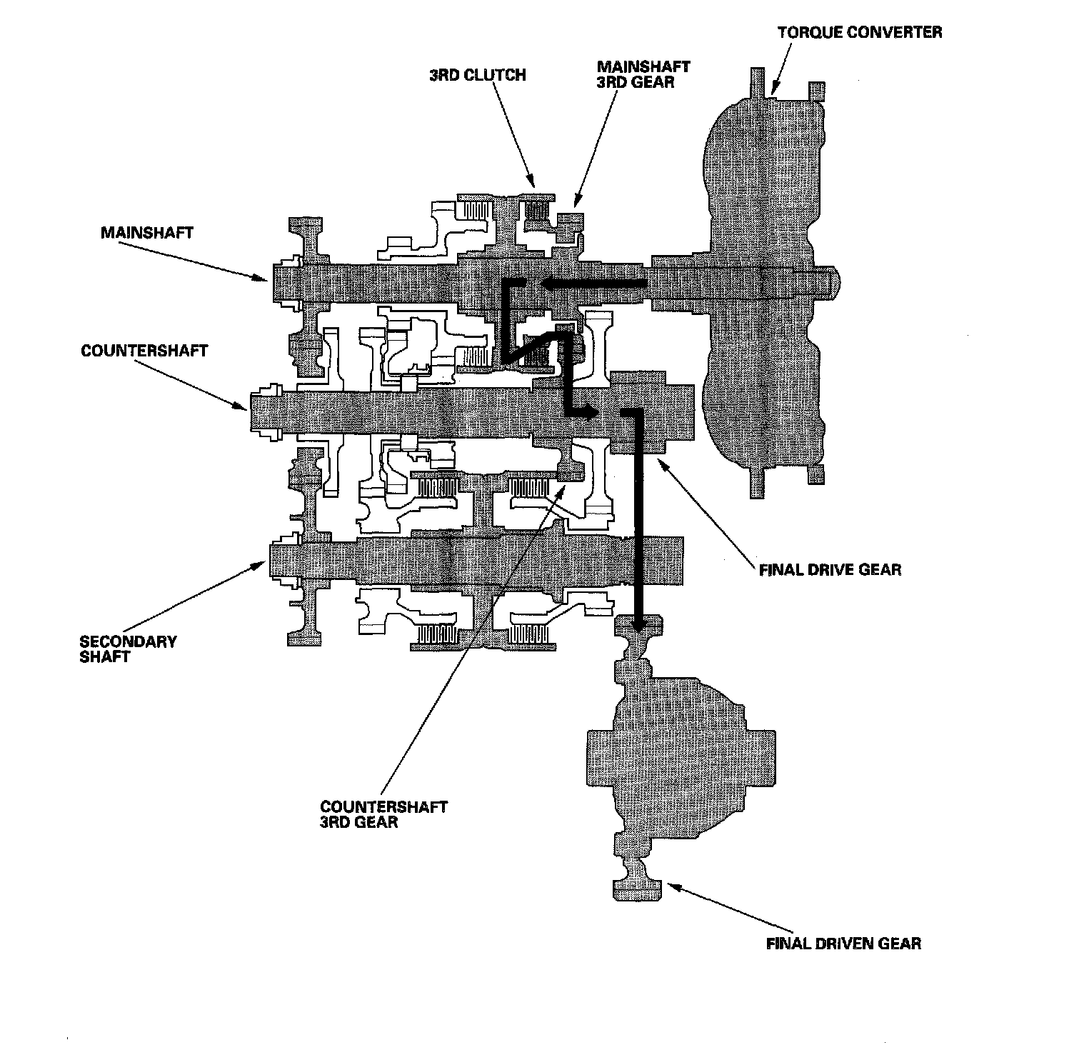- Hydraulic pressure is applied to the 3rd clutch, then the 3rd clutch engages the mainshaft 3rd gear with the mainshaft.
