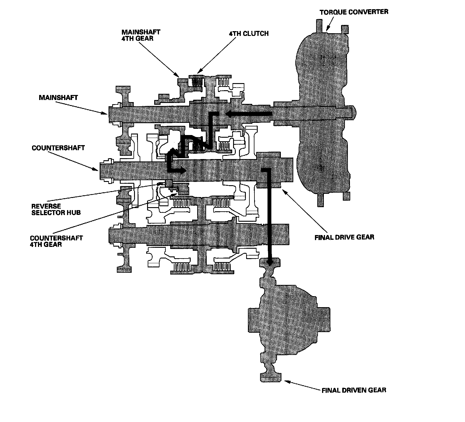 Engine power transmitted from the torque converter drives the mainshaft idler gear, the countershaft idler gear, and the secondary shaft idler gear, but hydraulic pressure is not applied to the clutches. Power is not transmitted to the countershaft. The countershaft 4th gear is engaged with the reverse selector hub and the countershaft by the reverse selector, when the shift lever is shifted in N position from D4 position. The countershaft reverse gear is engaged when shifted from R position.