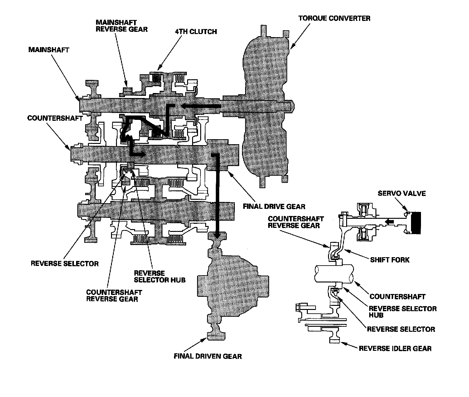 - Hydraulic pressure is applied to the servo valve to engage the reverse selector with the countershaft 4th gear while the shift lever is in the forward range (D4, D3, 2 and 1 position).