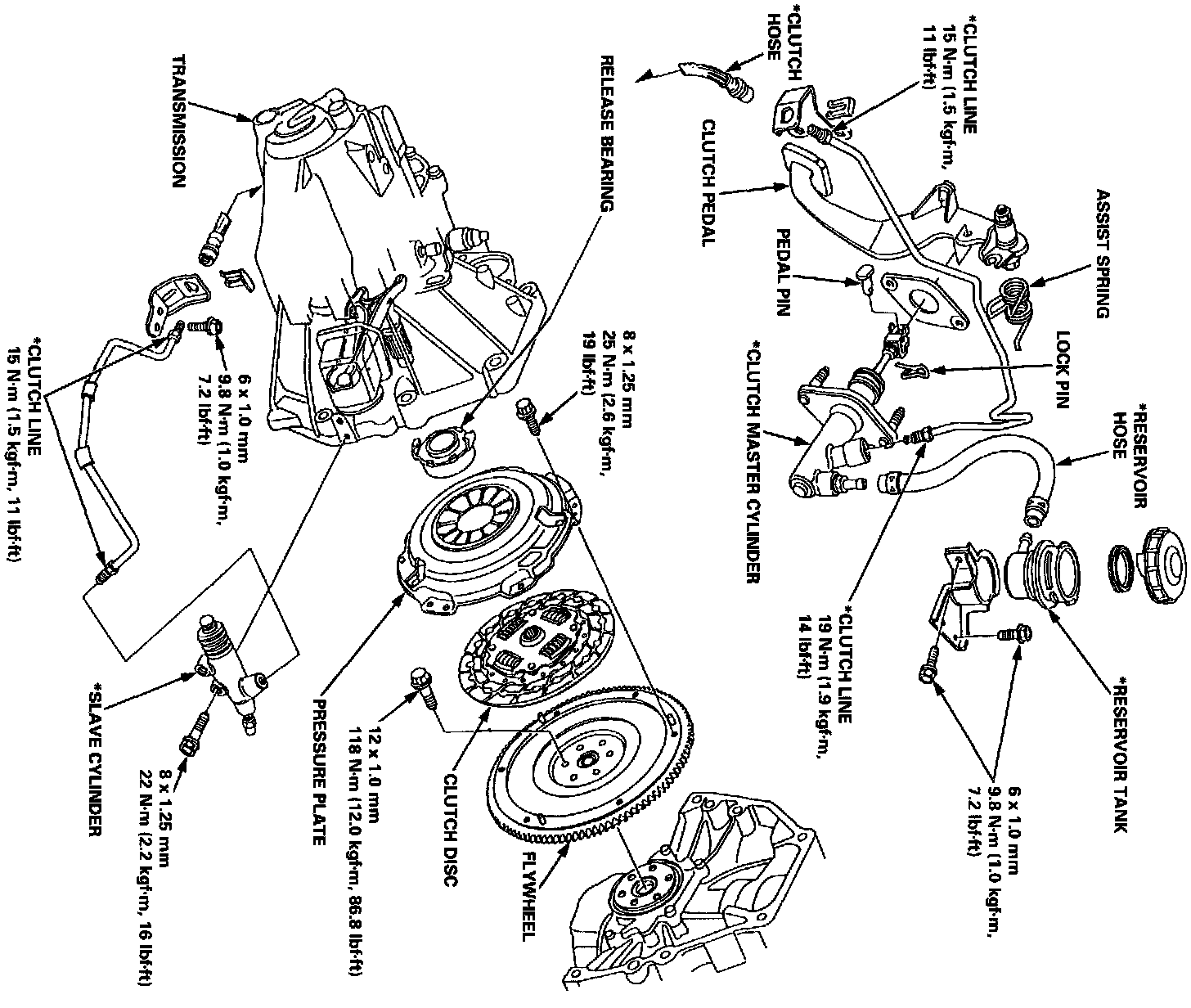 NOTE: Whenever the transmission is removed, clean and grease the release bearing sliding surface. If the parts marked with an asterisk (*) are removed, the clutch hydraulic system must be bled. Inspect the hoses for damage, leaks, interference, and twisting.