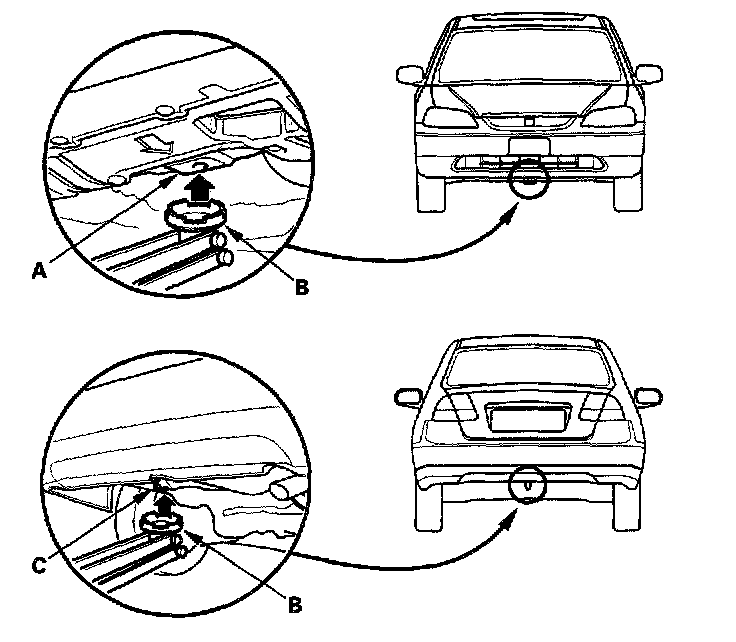 4. Position the floor jack under the front jacking bracket (A) or rear jacking bracket (B), center the jacking bracket in the jack lift platform (C), and jack up the vehicle high enough to fit the safety stands under it.