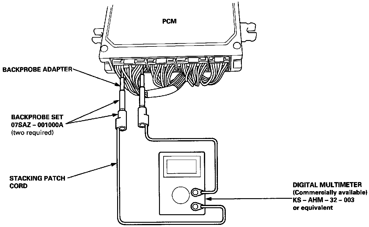 3. Inspect the circuit on the PCM according to the troubleshooting flowchart with the special tools and a digital multimeter as shown.