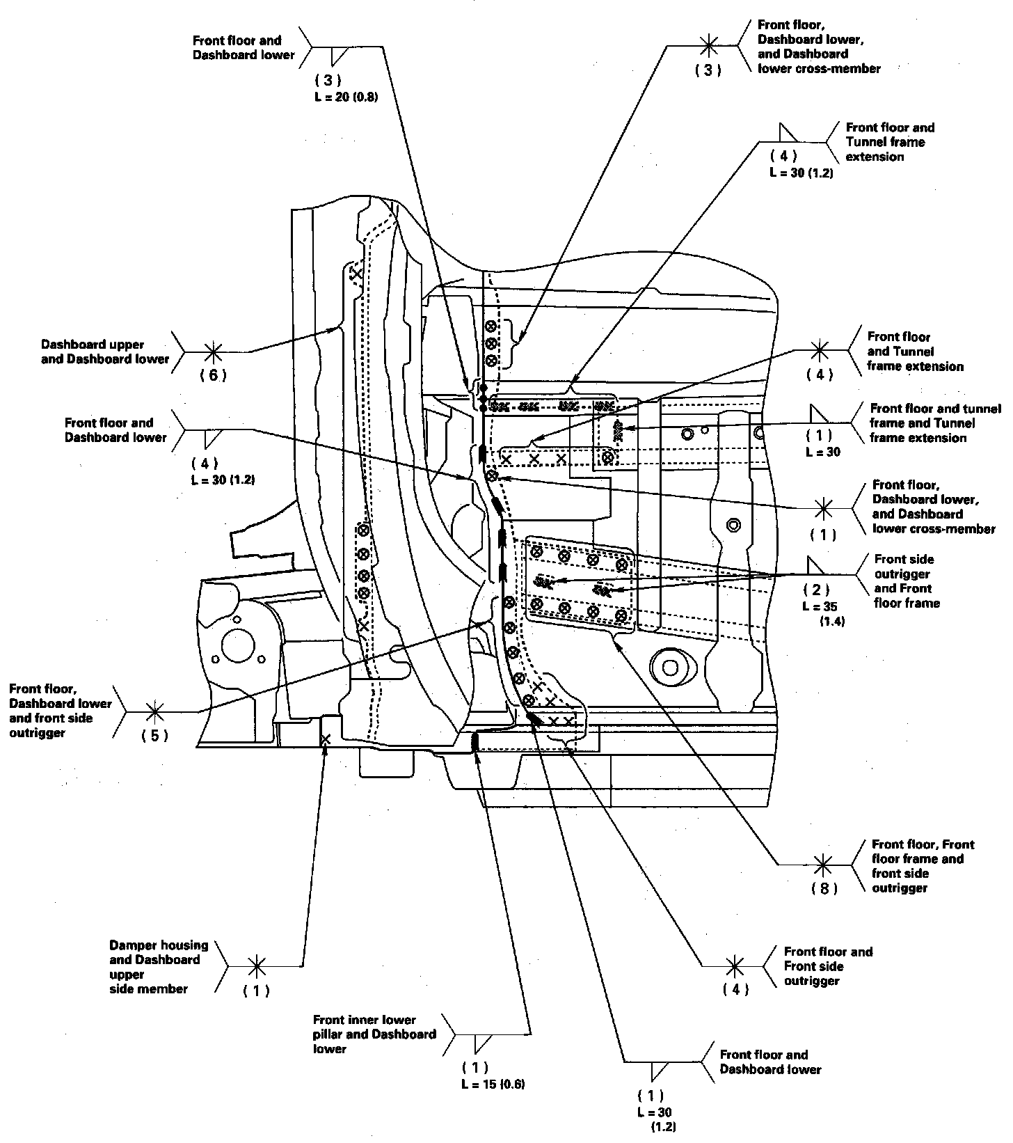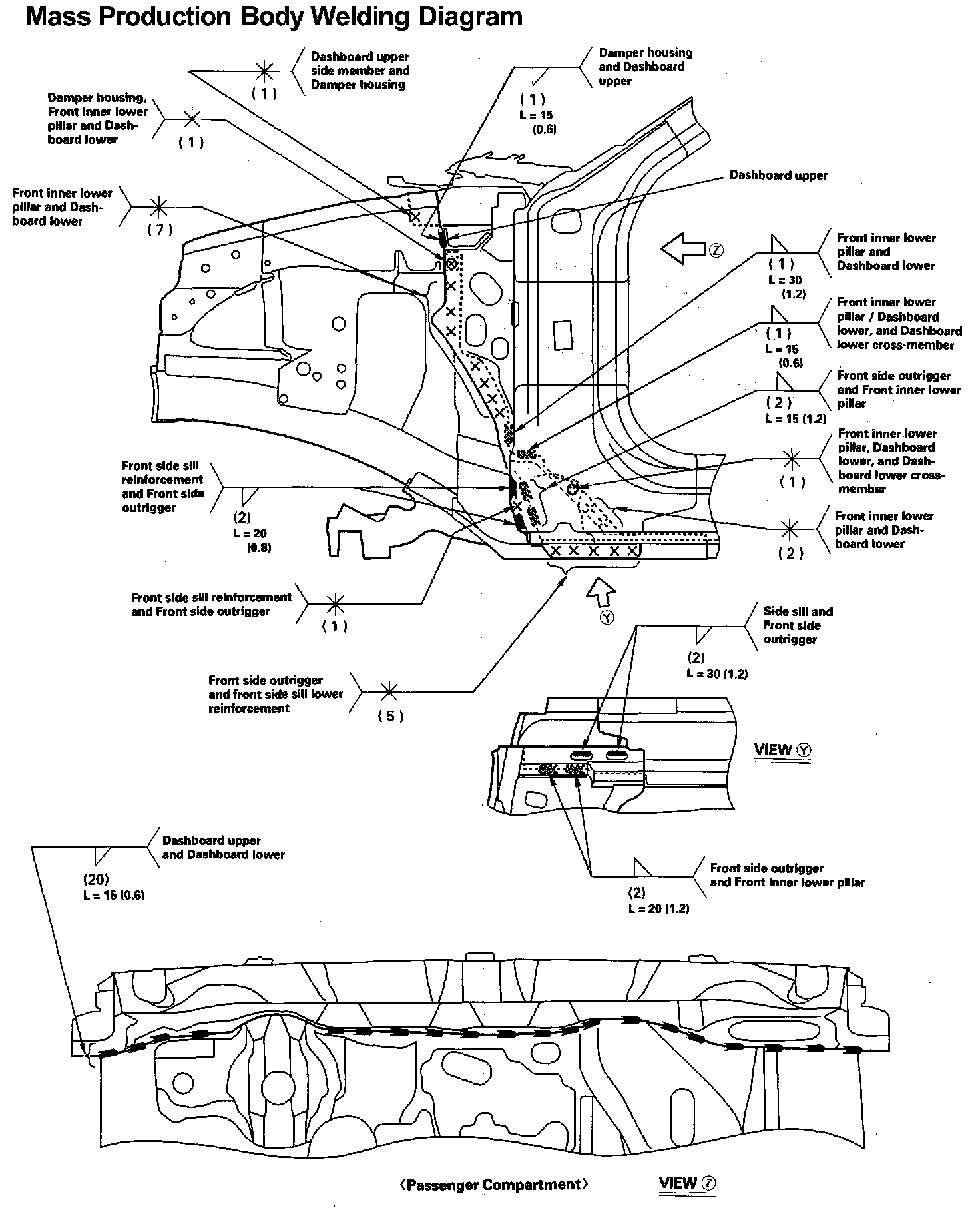 - Weld the damper housing, dashboard lower, and outrigger to the dashboard upper and front inner lower pillar.