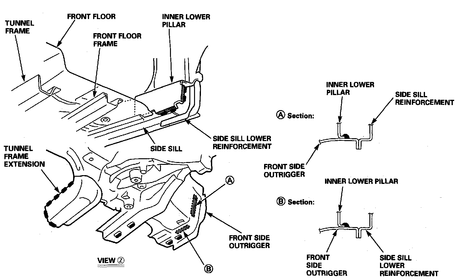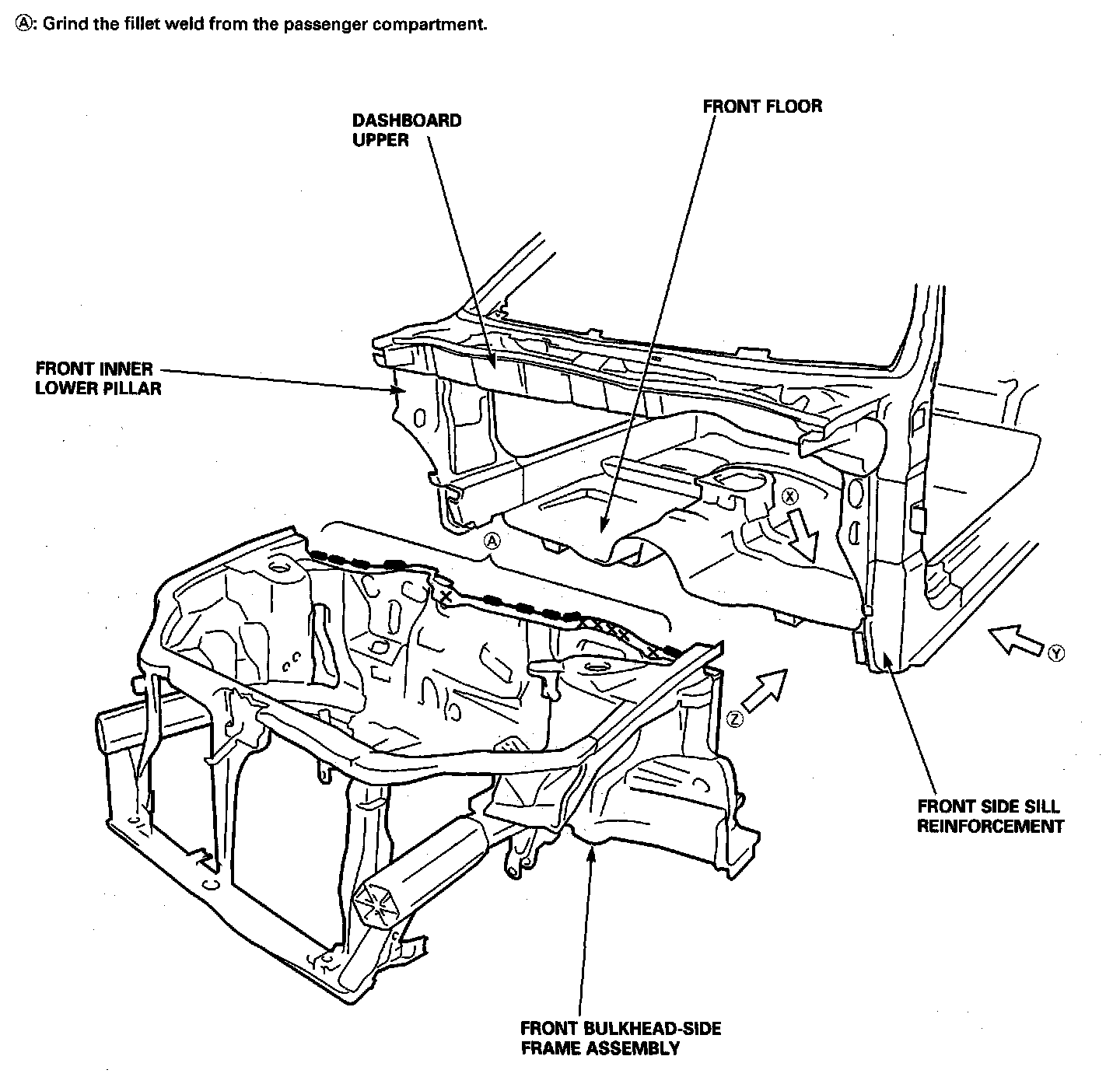 - Cut and pry off the front side outrigger and grind the fillet welds of the front inner lower pillar and front side outrigger.