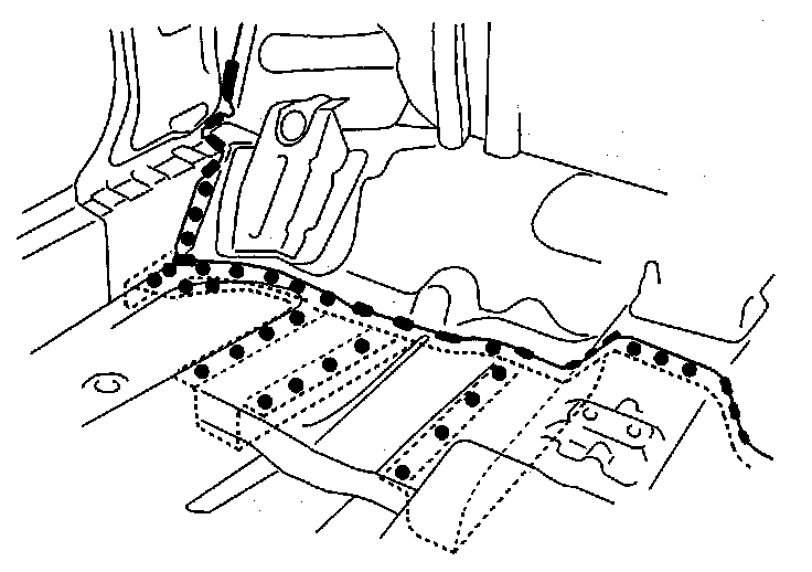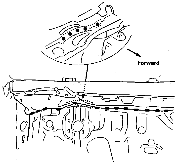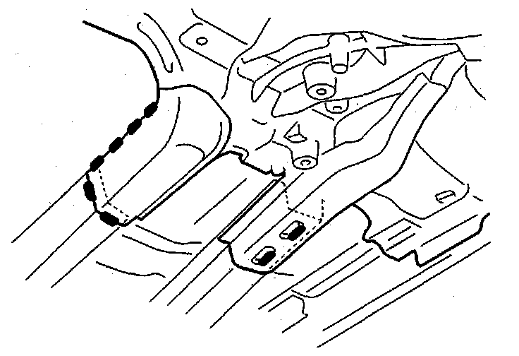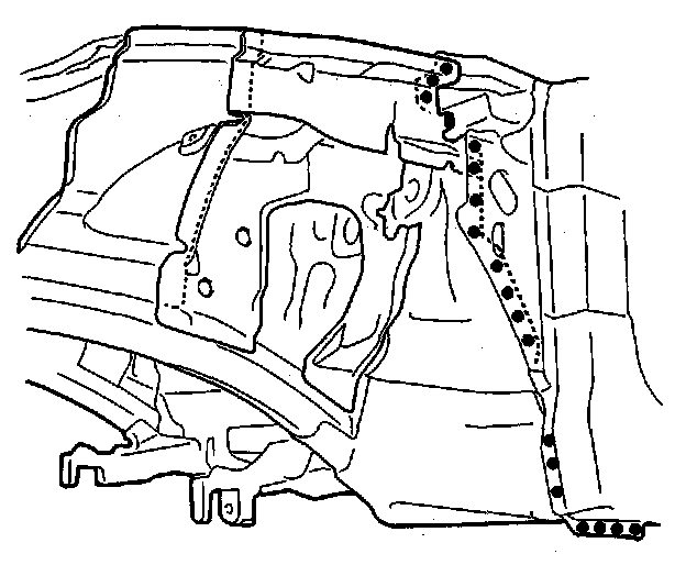 - Drill holes completely through the parts since the replacement front bulkhead-side frame assembly will be attached by plug welding.