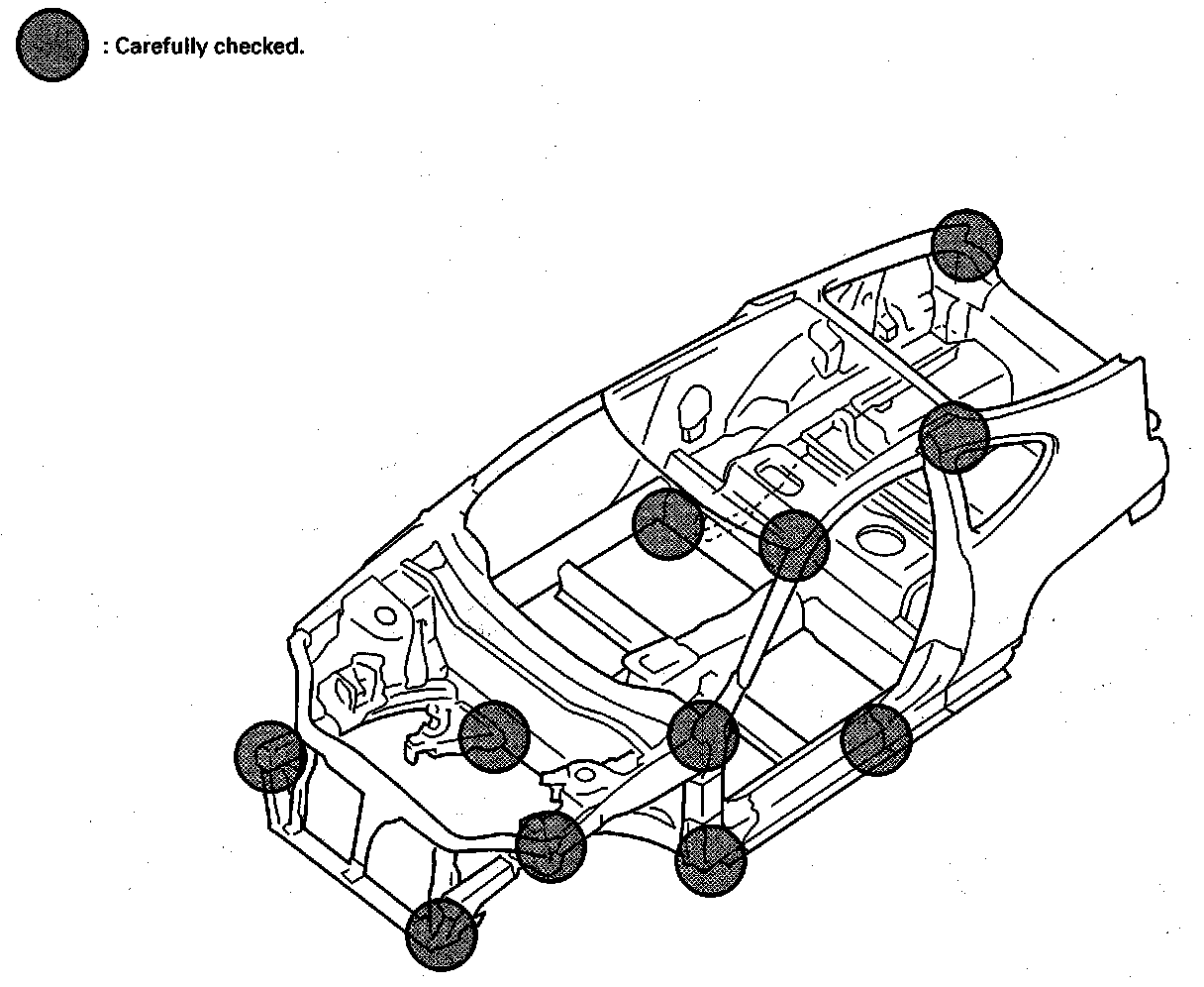 Distortion to the vehicle, bends, inclines, and gaps between parts should be throughly checked. Also, check for paint peeling at welded areas corners and the sealing coat.