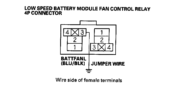 9. Connect the low speed battery module fan control relay 4P connector terminal No. 3 and body ground with a jumper wire.