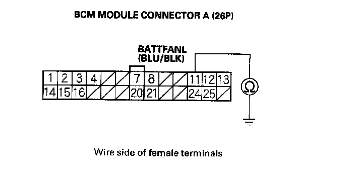 23. Check for continuity between body ground and BCM module connector terminal A24.