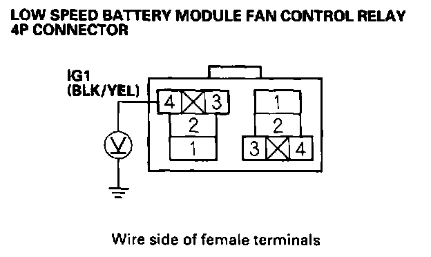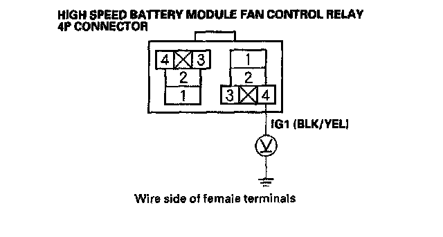 12. Measure voltage between body ground and the low speed battery module fan control relay 4P connector terminal No. 4.