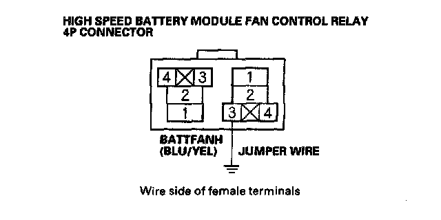 22. Connect the high speed battery module fan control relay 4P connector terminal No. 3 and body ground with a jumper wire.