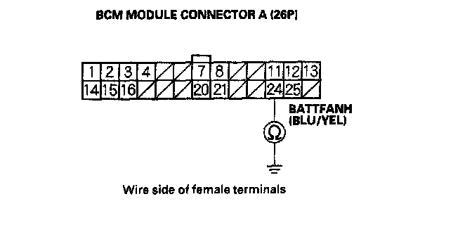 8. Disconnect BCM module connector A (26P) and the low speed battery module fan control relay 4P connector.