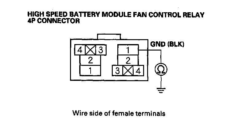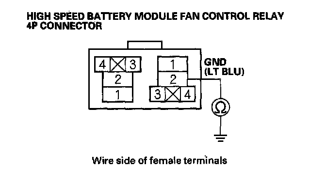 14. Check for continuity between body ground and the low speed battery module fan control relay 4P connector terminal No. 1.