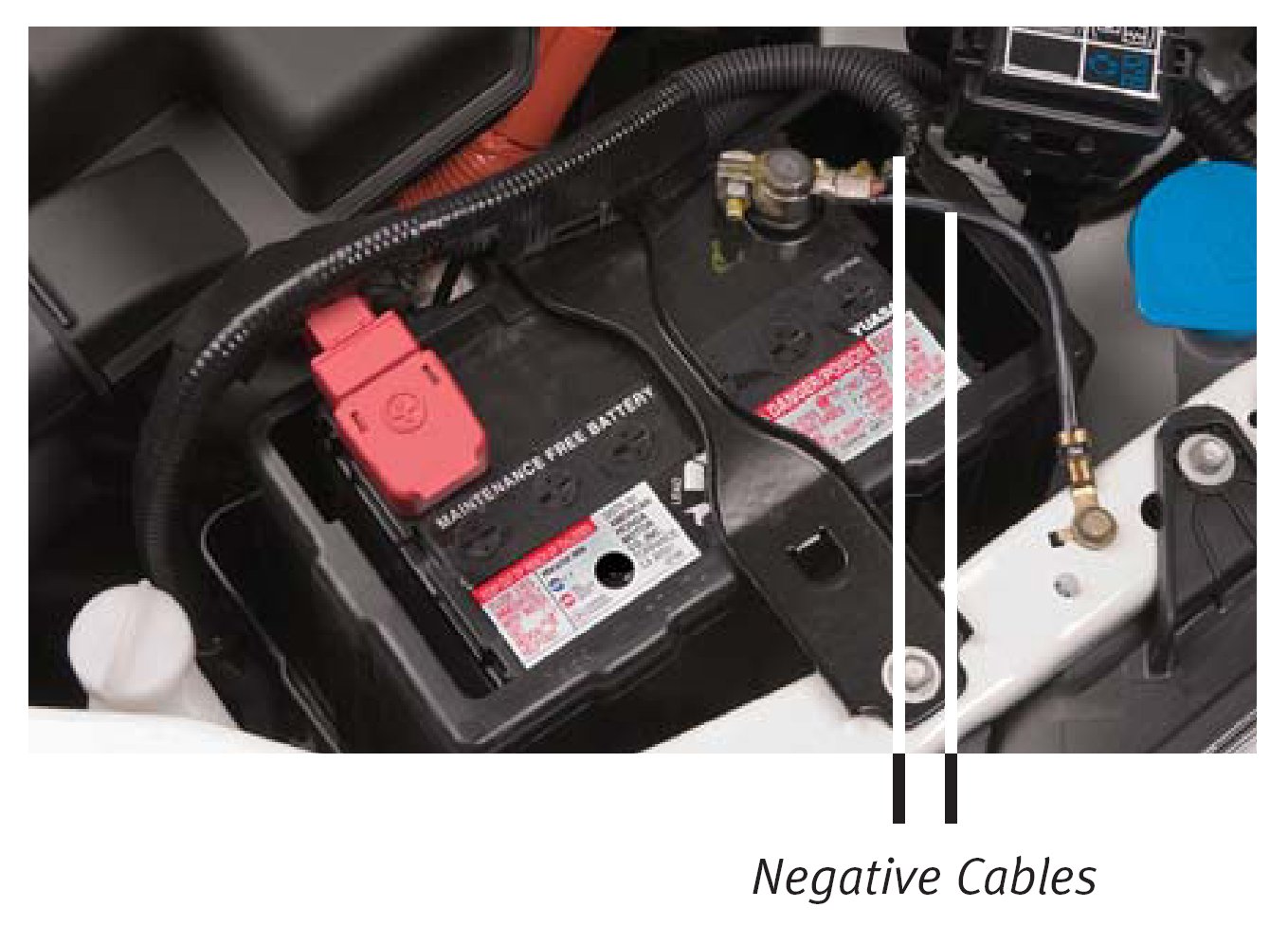 Remove the main fuse, and cut both negative 12-volt battery cables. Removing the main fuse turns off the engine and the electric motor, preventing current flow from the motor into the cables. It also cuts power to the airbags and the seat belt tensioners.
