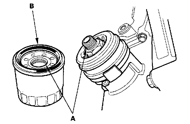 3. Inspect the threads (A) and rubber seal (B) on the new filter. Wipe off the seat on the engine block, then apply a light coat of oil to the filter rubber seal. Use only filters with a built-in bypass system.