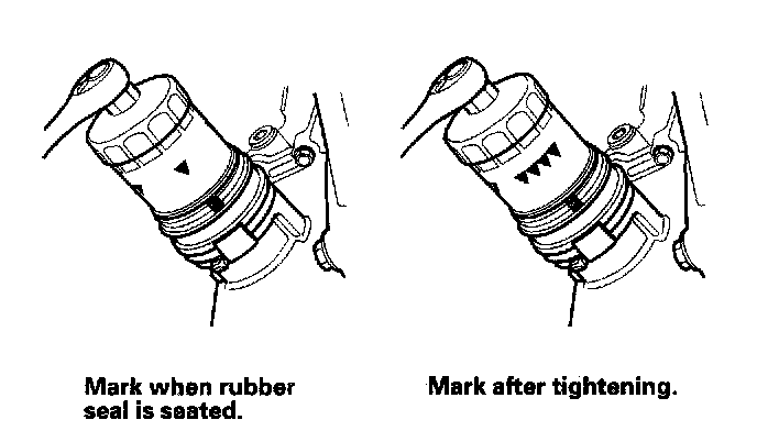 ^ Tighten the filter by turning it clockwise three marks from the one you noted. For example, if the v Mark is at the bottom when the seal is seated, tighten the filter until the center of the vvvv mark comes around to the bottom.