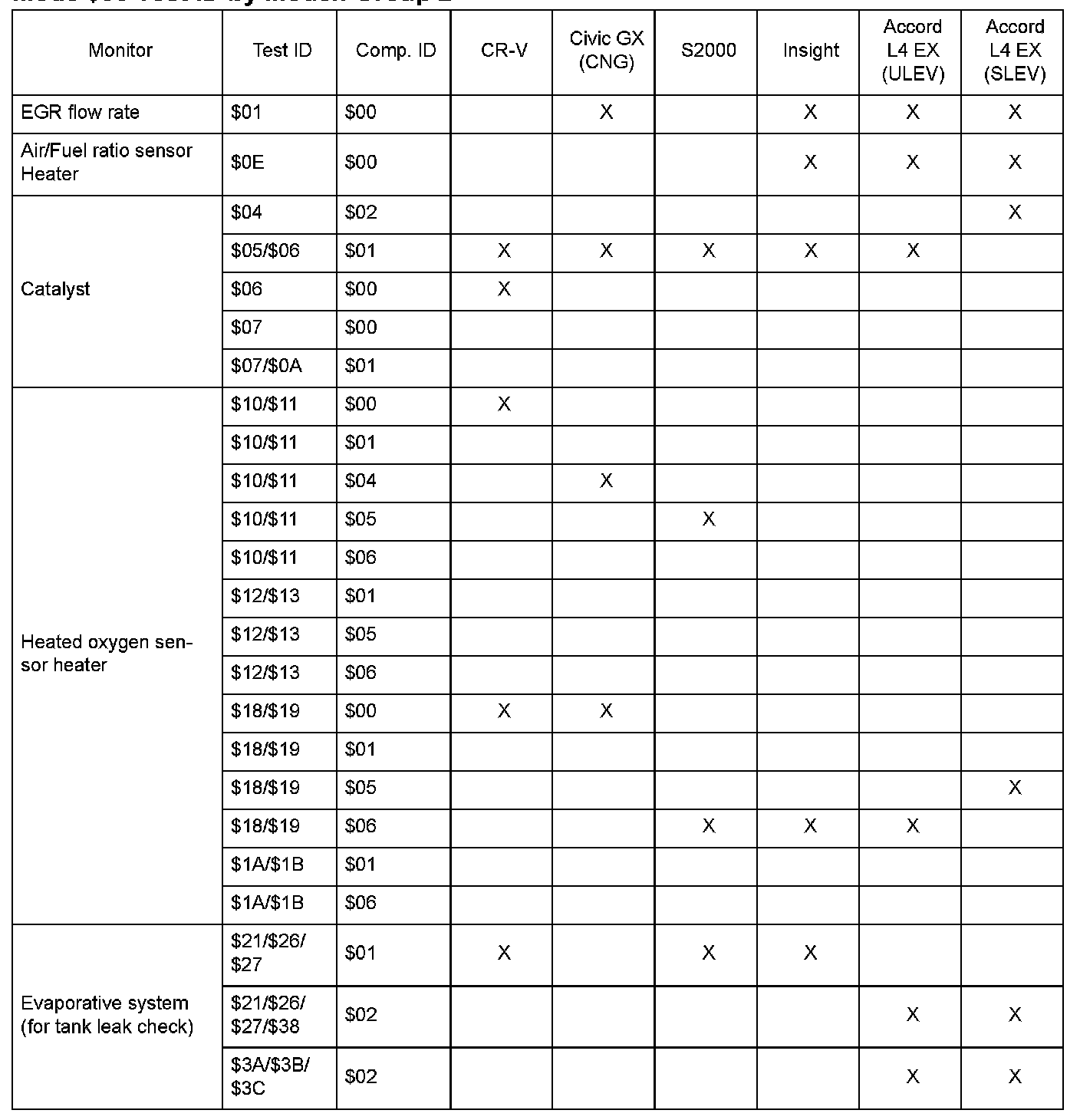 Mode $06 Test ID by Model: Group 2