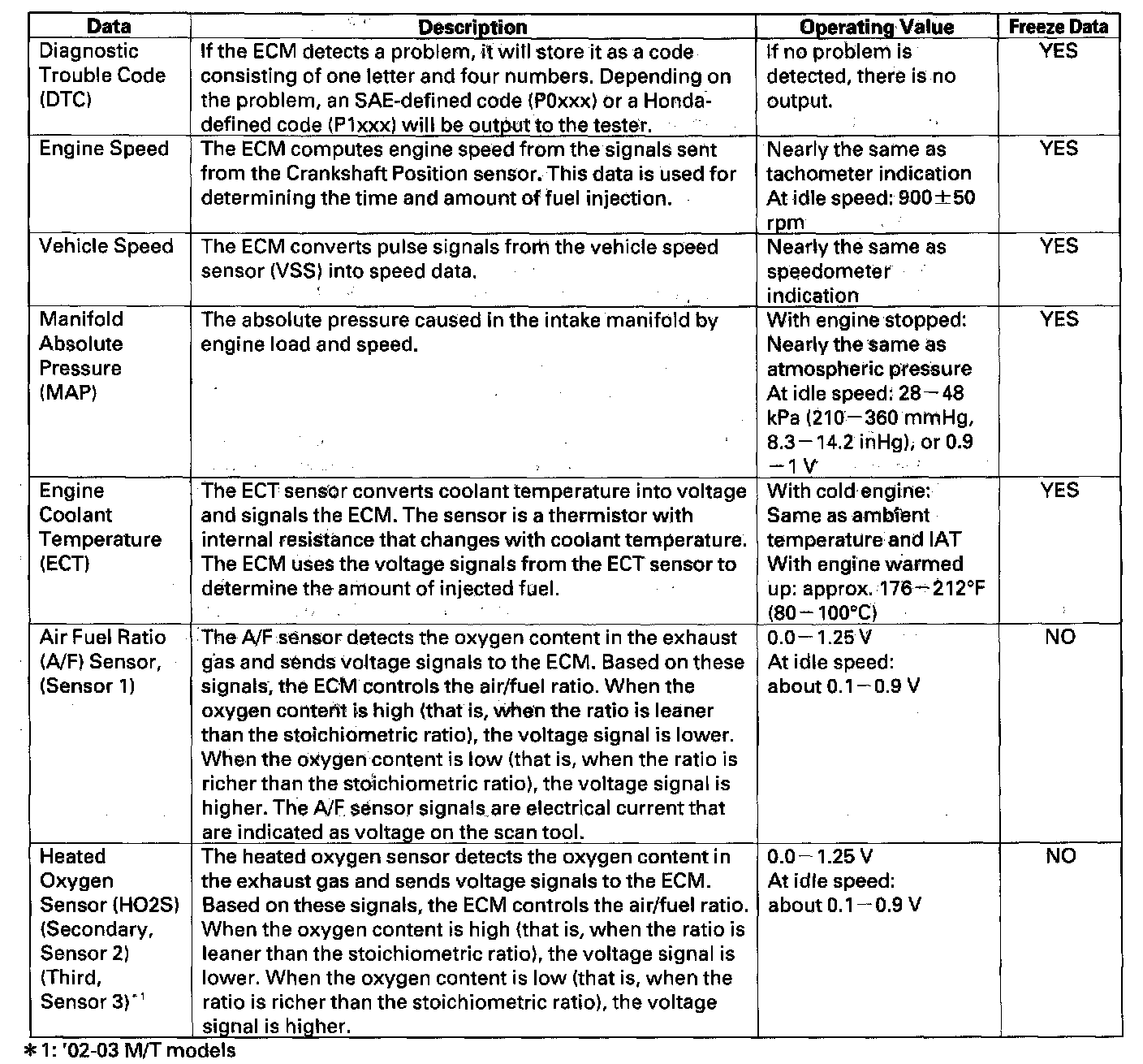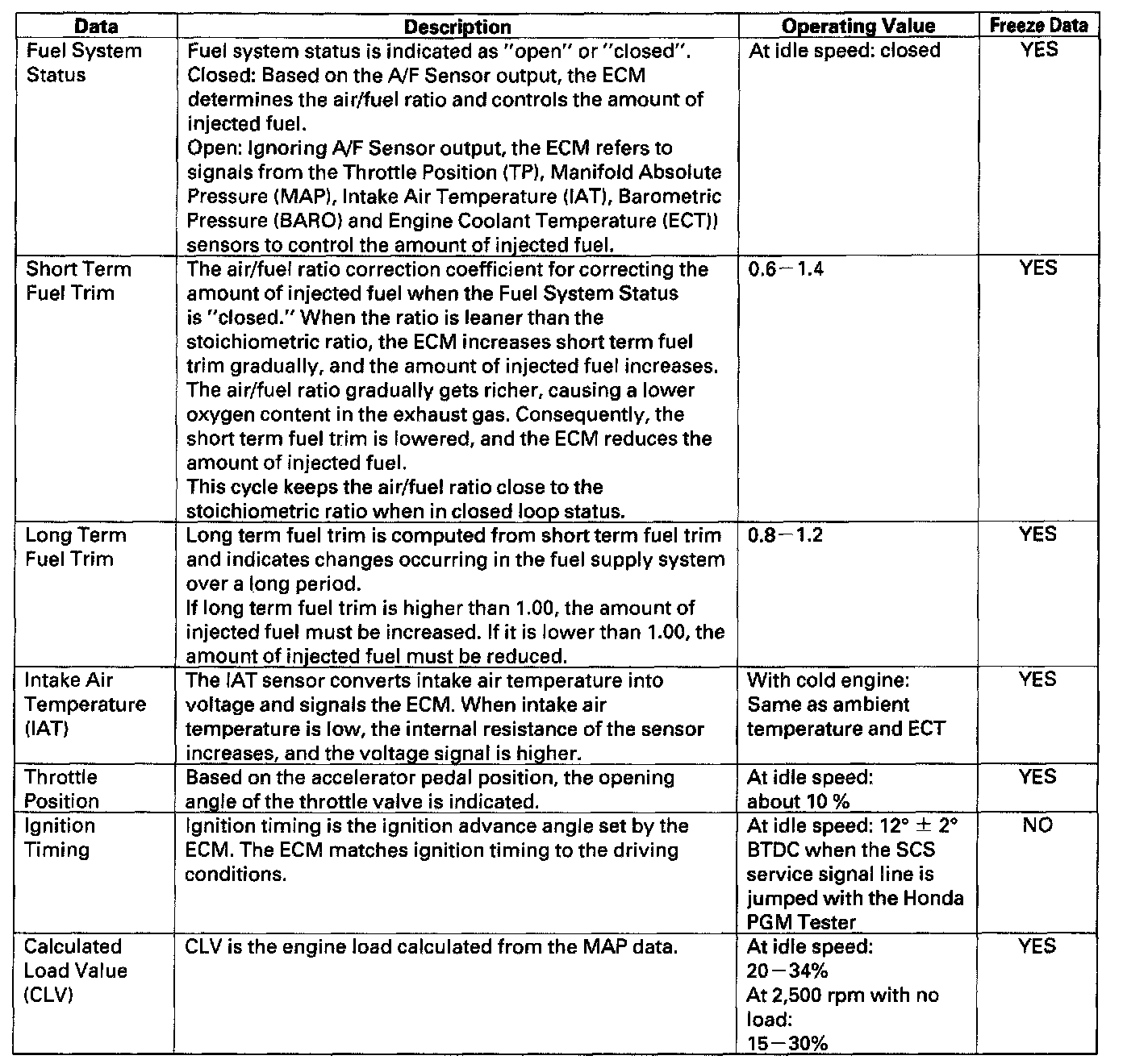 You can retrieve data from the ECM by connecting the OBD II scan tool or the Honda PGM Tester to the 16P data link connector (DLC). The items listed in the table below conform to SAE recommended practice. The Honda PGM Tester also reads data beyond that recommended by SAE. Understanding this data may help you find the causes of intermittent problems.